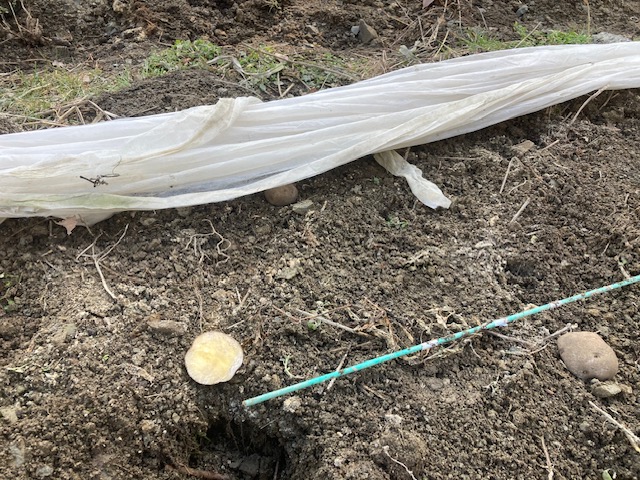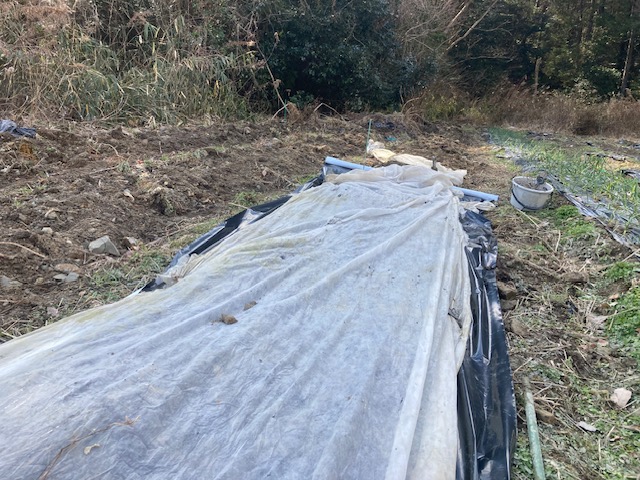 今回は、キタアカリを早く収穫するために2月上旬に植え付けを行い、黒マルチと不織布で保温・霜対策をしました。